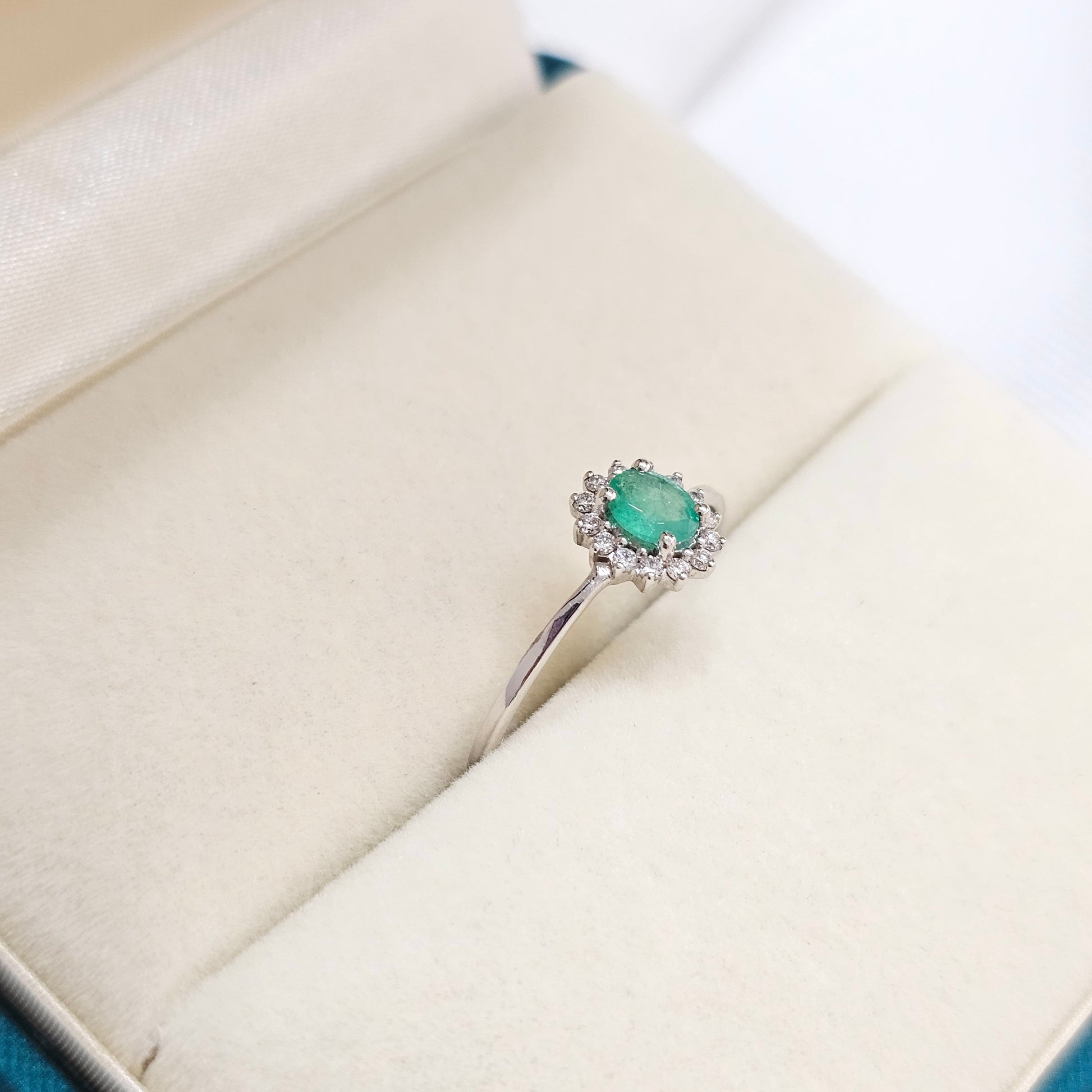 Anillo con 32 puntos de Esmeralda natural y 12 puntos totales de Diamantes naturales en oro blanco 14k.