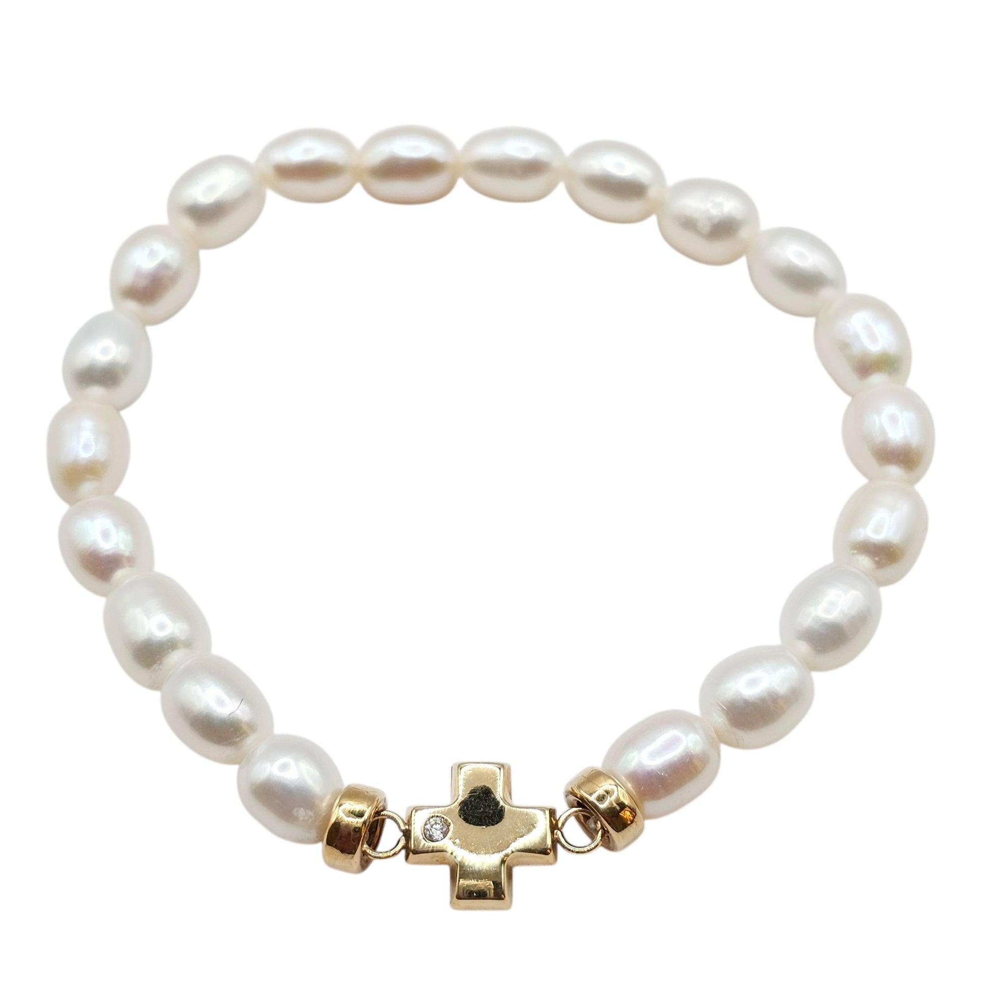 Pulsera elástica con perlas freshwater y cruz en oro sólido 10k