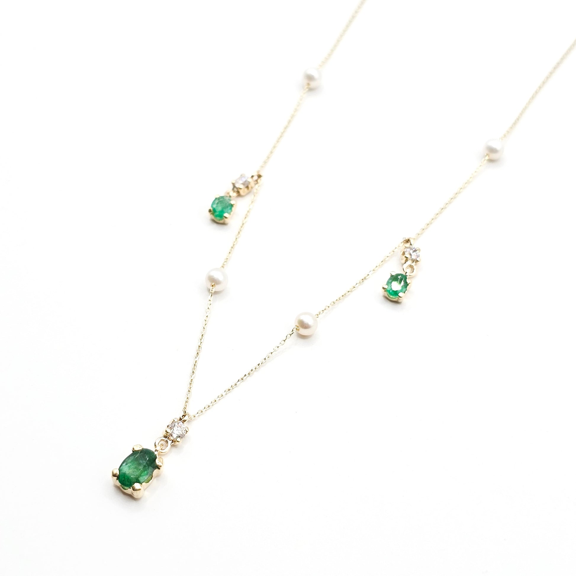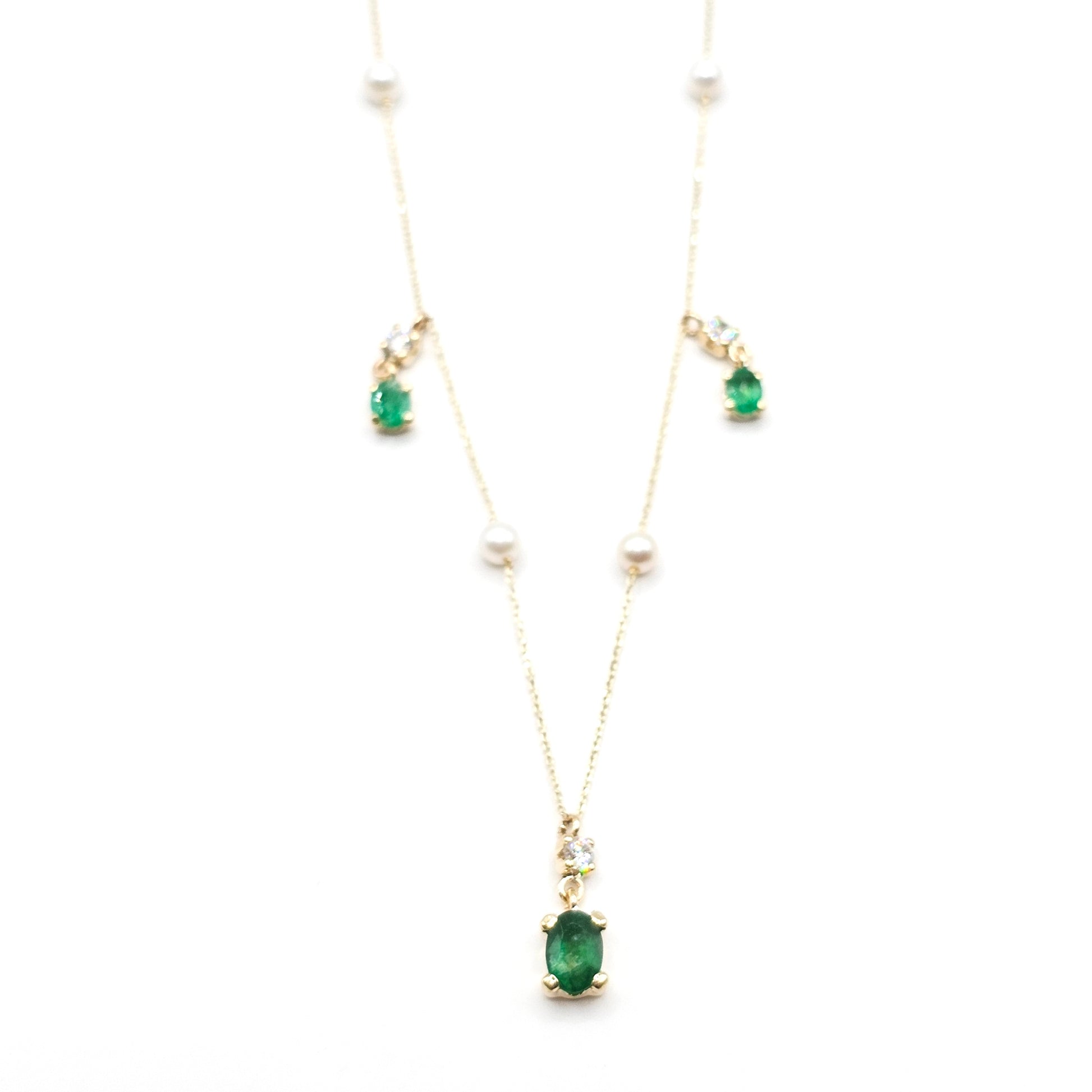 Gargantilla con esmeraldas naturales, perlas cultivadas y zirconias en oro sólido 10k