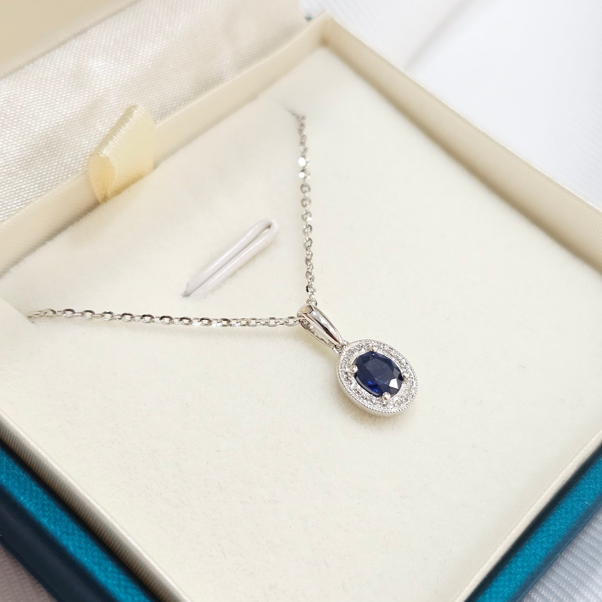 Dije con 41.7 puntos de Zafiro natural con 3.7 puntos de diamantes naturales en oro blanco 14k. Incluye cadena en oro blanco 14k.