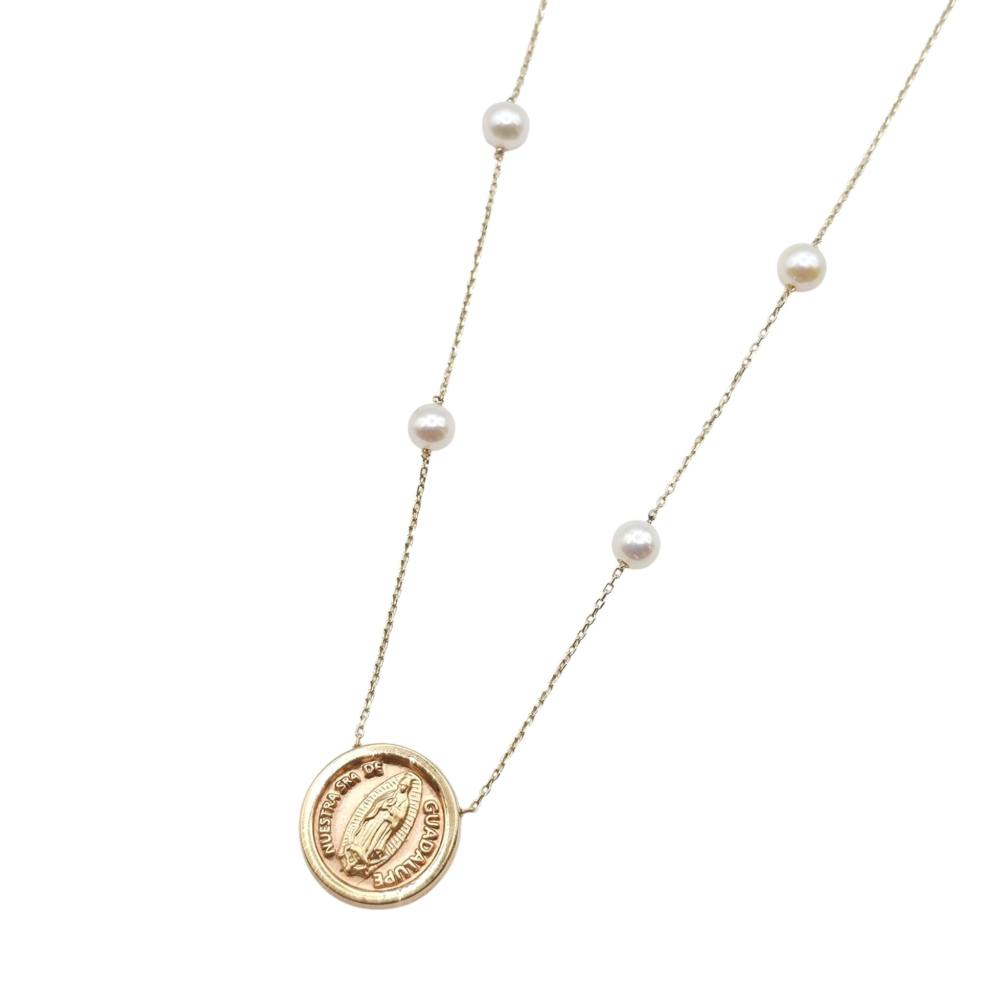 Gargantilla de la Virgen de Guadalupe con perlas freshwater en oro sólido 10k